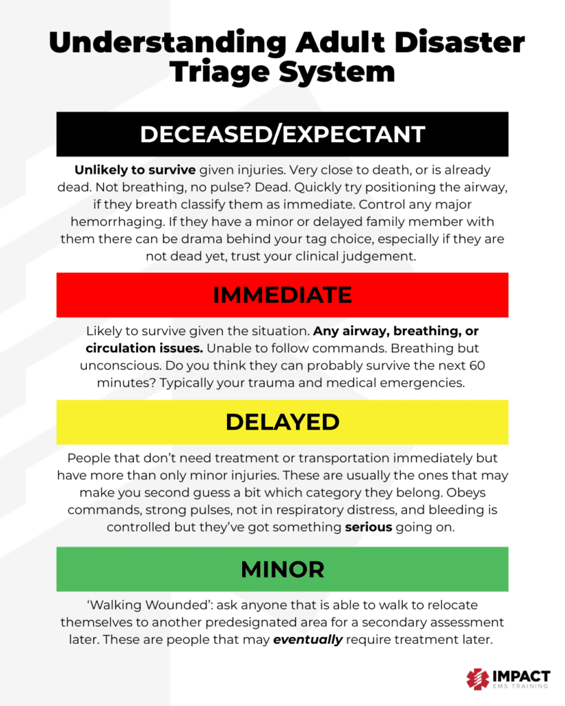The image you shared outlines the four core adult triage categories used in disaster medicine. Each color tag represents urgency, not value or worth.
